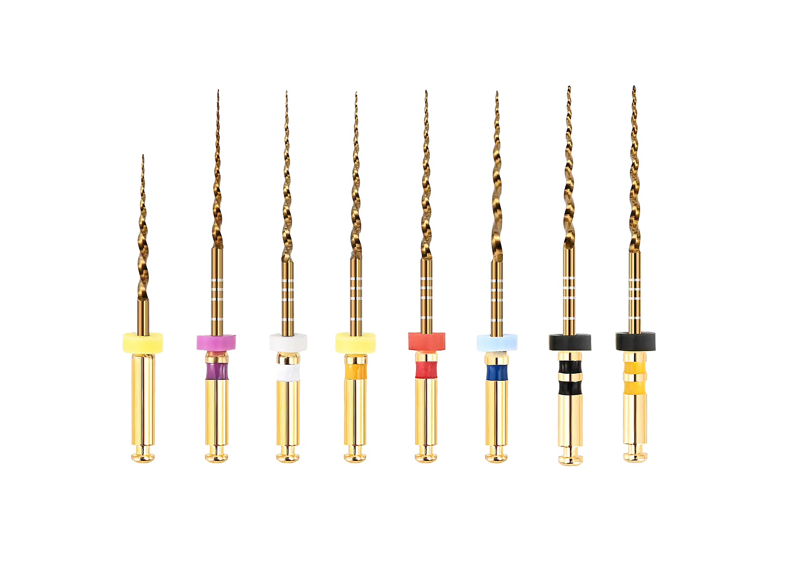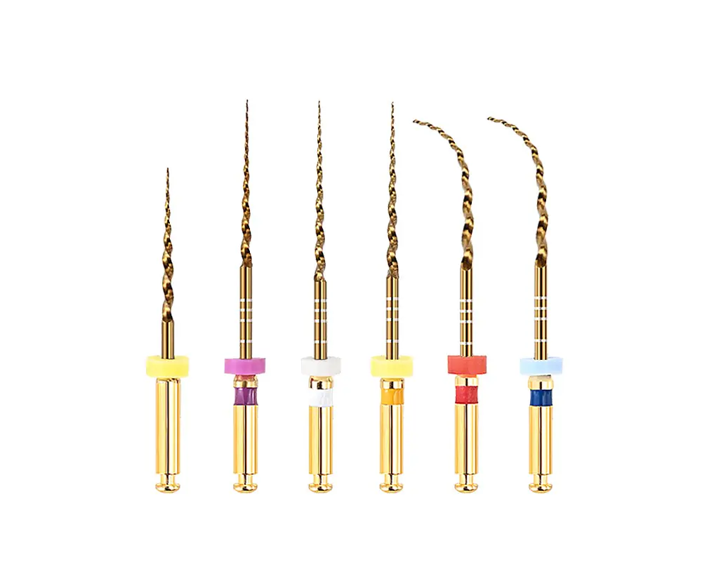 Features ~ Use of High quality Golden NiTi material with Heat Activation technology Greater resistance to cyclic Fatigue Triangular cross section enabling higher cutting efficiency Non cutting tips design helps prevent the risk of apical transportation Variable Taper design makes it easier to bring out debris and preserve the dentin.