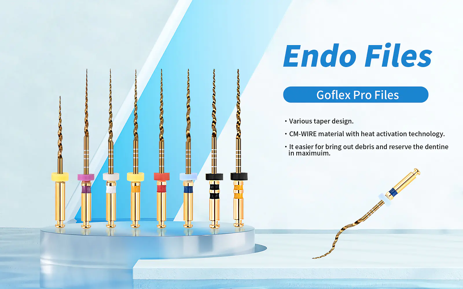 Features ~ Use of High quality Golden NiTi material with Heat Activation technology Greater resistance to cyclic Fatigue Triangular cross section enabling higher cutting efficiency Non cutting tips design helps prevent the risk of apical transportation Variable Taper design makes it easier to bring out debris and preserve the dentin.