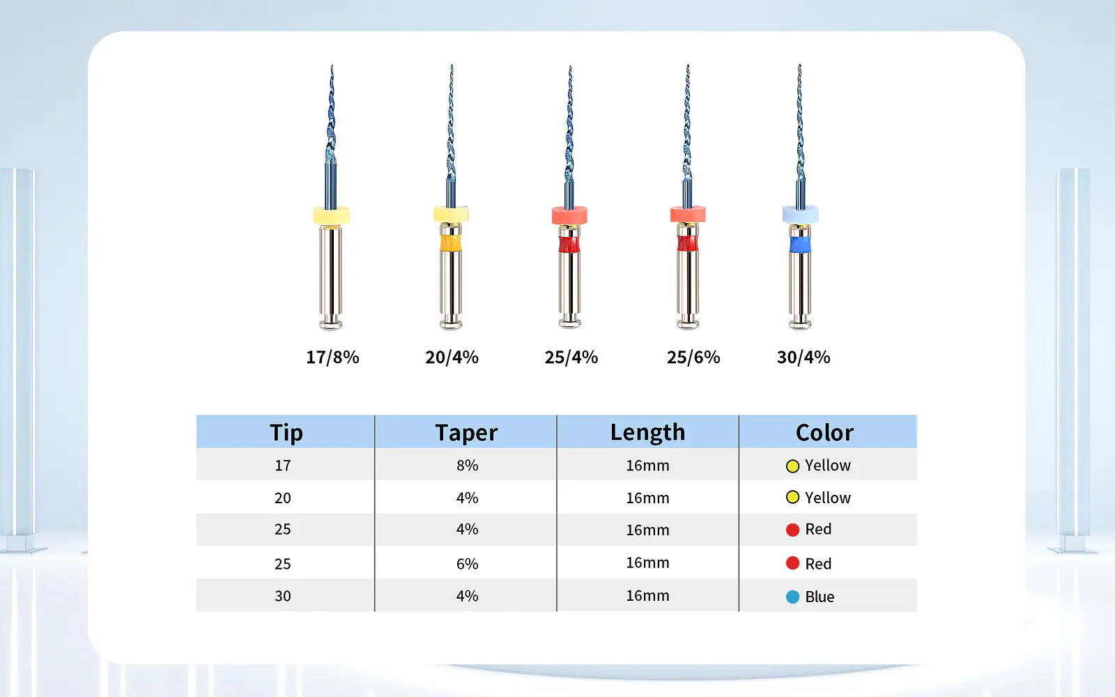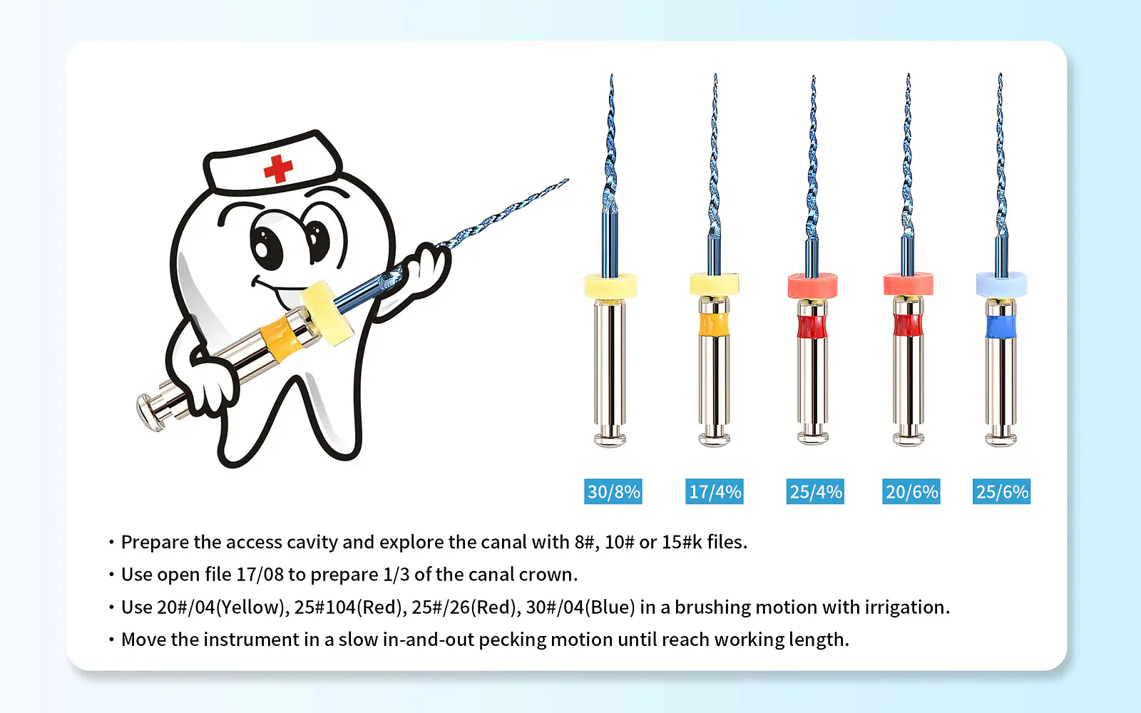 Features ~ Special design and length for deciduous teeth and patients with limited mouth opening Blue CM wire technology with Heat Activation More resistant to cyclic fatigue and more safe during treatment | How to use~ Prepare the access cavity and explore the canals with 10# and 15# no files Use 17.08 to 1/3rd of the canal Use 20.04 (yellow) 25.04(red) 30.04(blue) in brushing motion with irrigation Move the instrument in short brushing and pecking motion slowly till you reach the apex Package 5 pcs/Pack