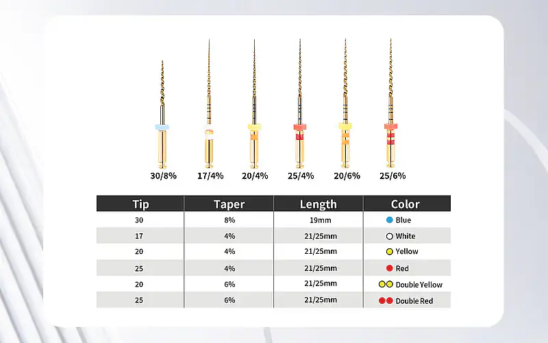 Features ~ CM wire technology with Heat Activation Can be prebent, more flexibility 200% Greater resistance to cyclic fatigue More Flexible and safe during treatment Greater cutting efficiency due to convex triangular cross section and nano coating technology for golden color Non cutting tips design helps prevent the risk of apical transportation | Package ~ (assorted) 6pcs/Pack | Steps to Use ~ Prepare the access cavity and explore the canals with 8# 10# and 15# k files (Glide path) till apex Use 17.04, 20.04, 25.04 slowly with brushing motions along with hypo in the canals For larger canals use 20.06 and 25.06 Move the instrument slow with slow and gentle apical pressure in and out in pecking motion and brushing till you the apex reach
