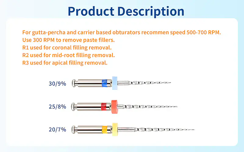 Features ~ Retreatment files are designed to remove filling materials such as gutta percha, carries and paste fillers prior to reshaping procedures 3 available lengths to remove the filling material from coronal middle and apical third of the canals Use For carrier based fillings and gutta percha the recommended speed is 600-700 RPM For removing paste fillers the recommended speed is 400-500 RPM ER3 is used for removing fillings from coronal third of the canals ER2 is used for removing fillings from middle third of the canals ER1 is used to remove the fillings from apical third of the canals Make sure to use irrigant such as GP solvent or hypo while using the files Do not force the files into the canals Gentle apical pressure with brushing motion entangled the GP out of the canal Do not go above the recommended speed and Torque